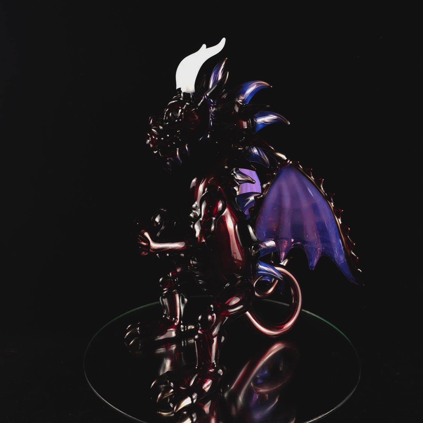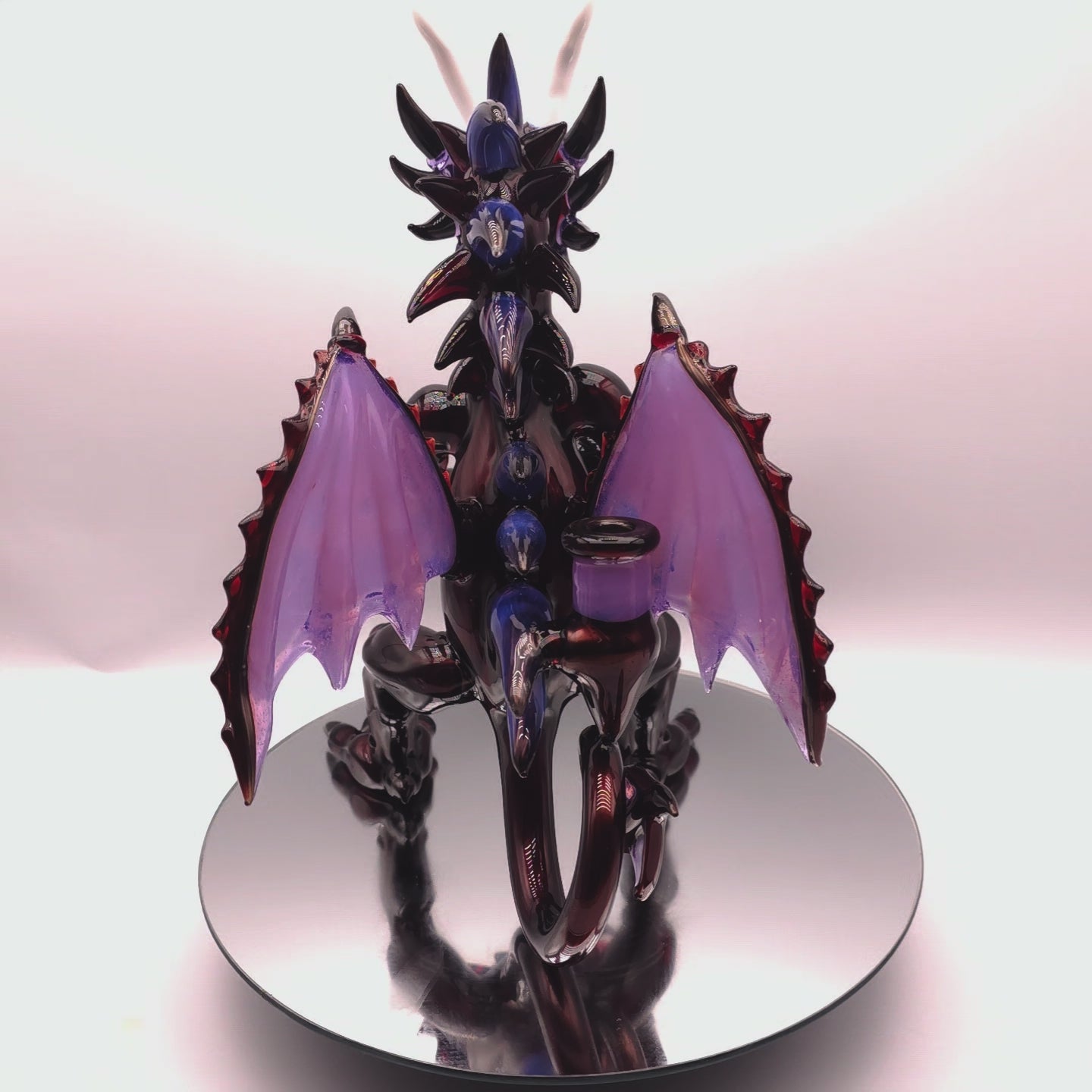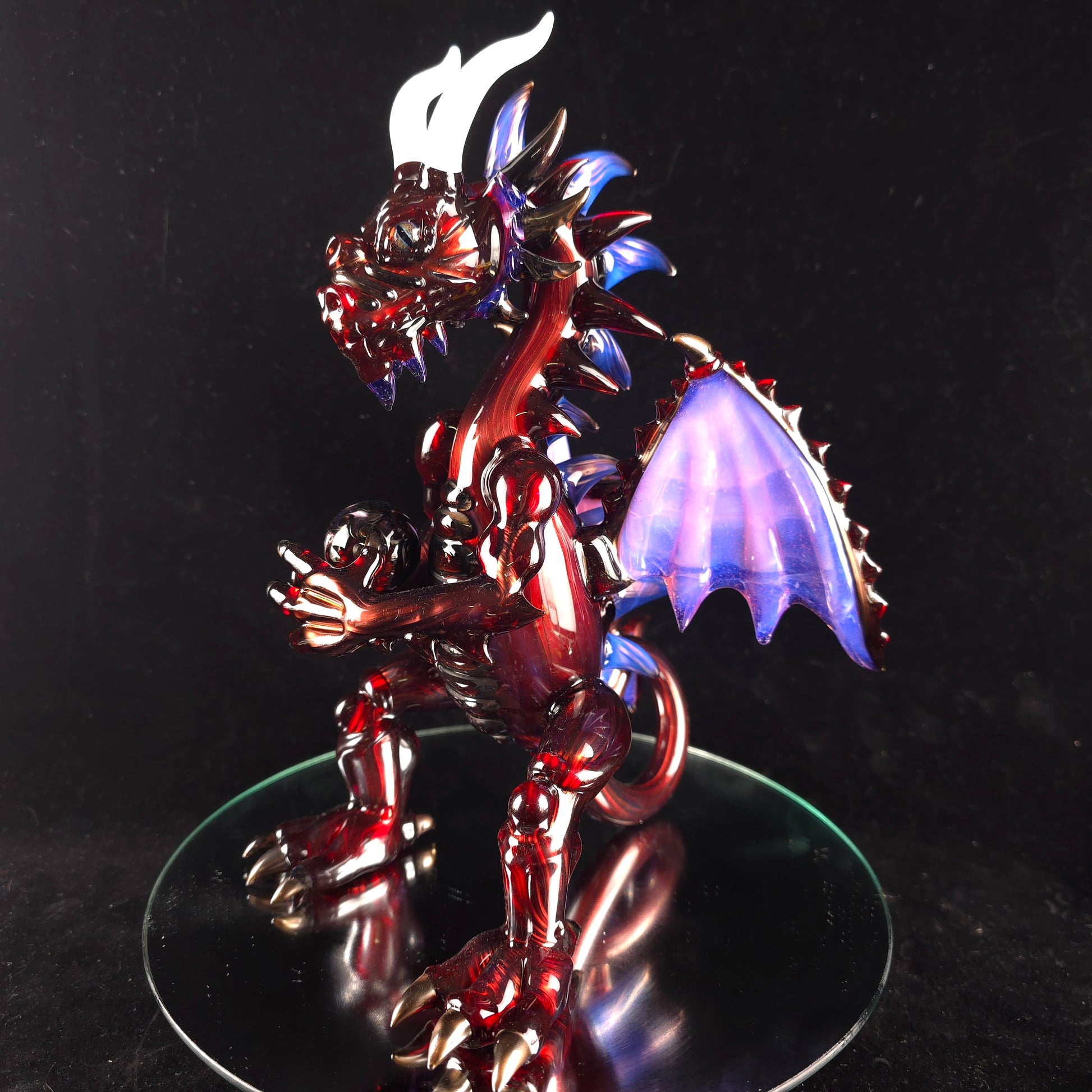 This dragon is made from 3 layers of color. Ruby slippers, over gold purple over electrum. Clothing a beautiful opal marble. Standing just over 9 inches tall and featuring a 10mm input with a 2 hole diffy. Signed and dated.