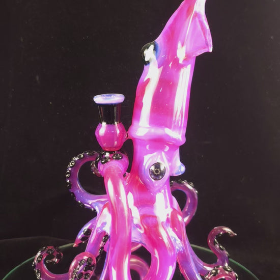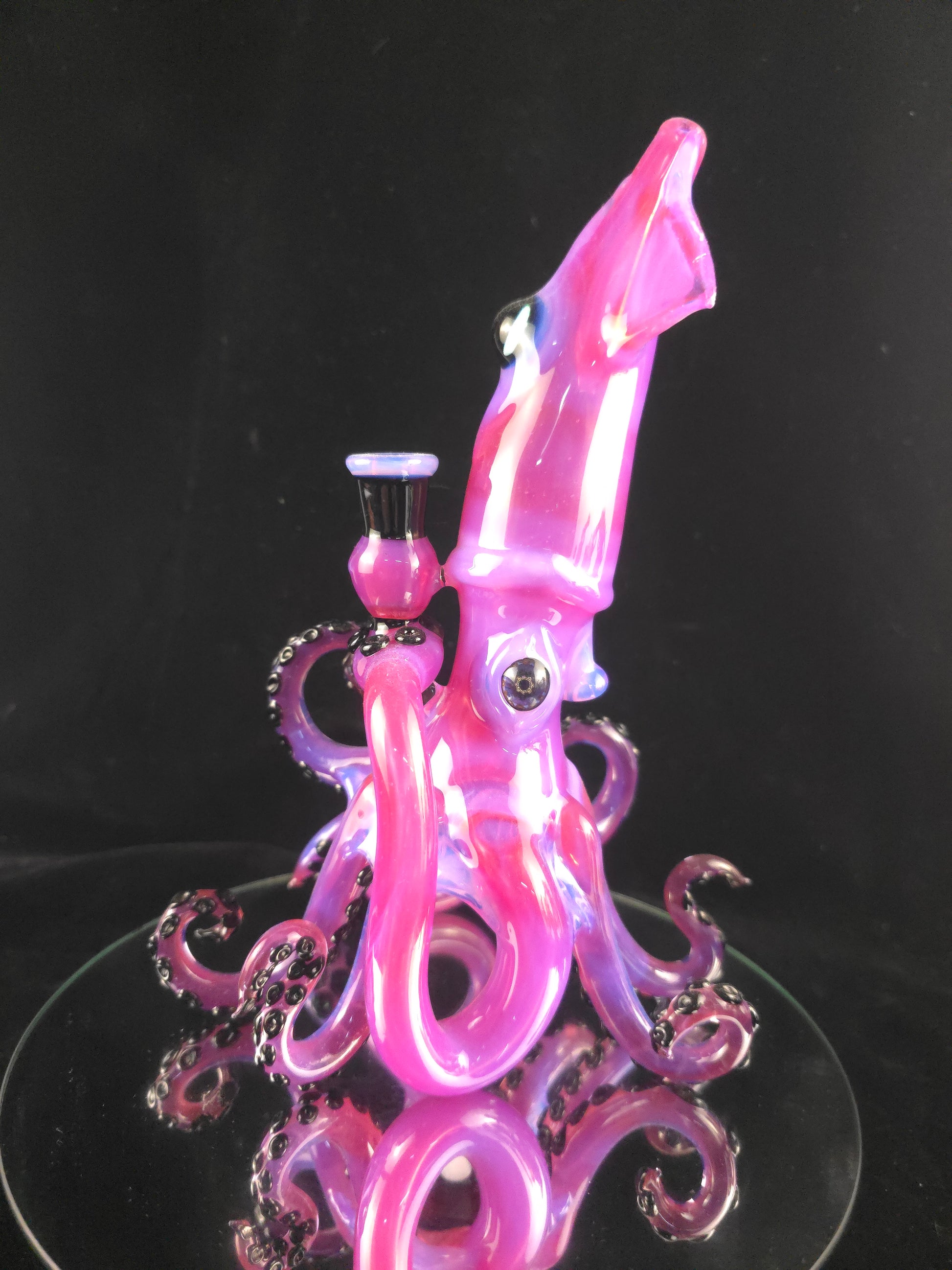 This squid sculpture stands roughly 10 inches tall and is a striking pink color. Beautiful flowing temticals on this one. 10mm input with a 2 hole diffy. Signed and dated.