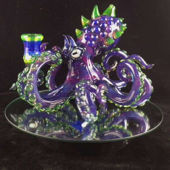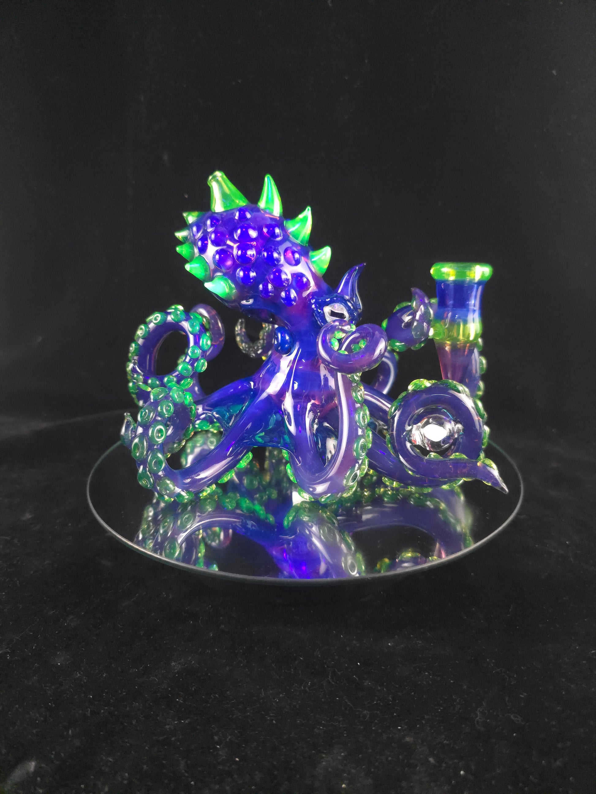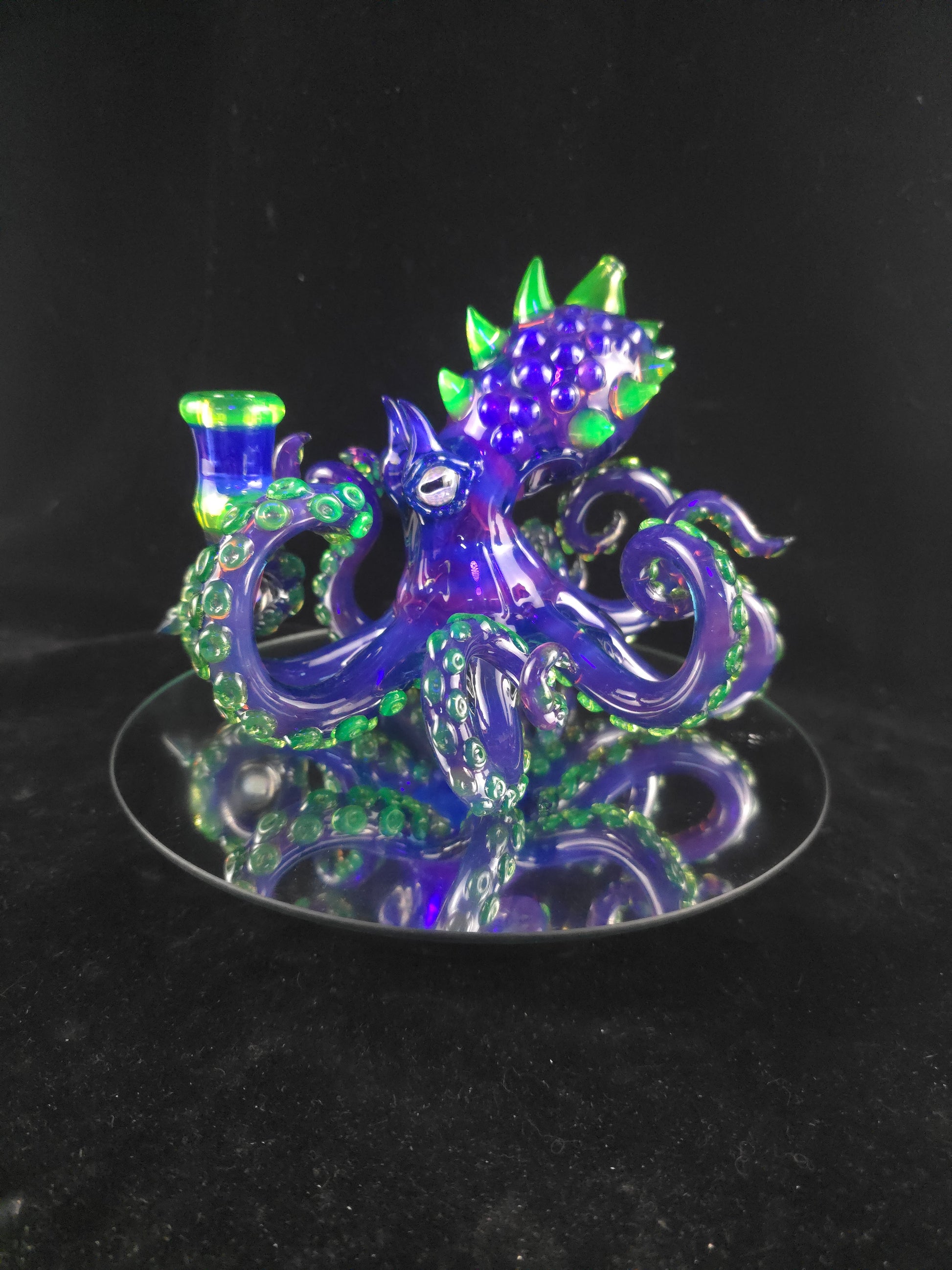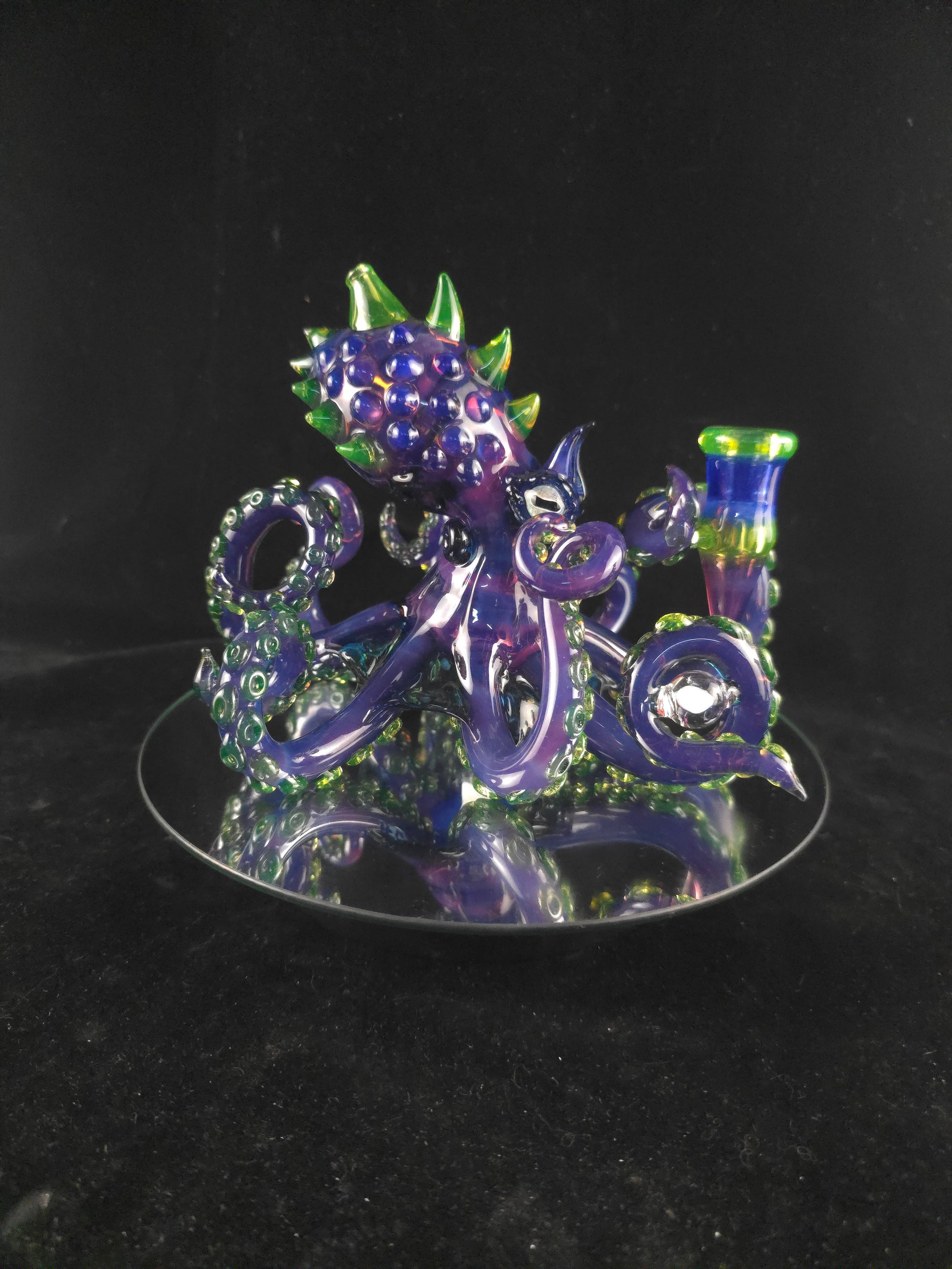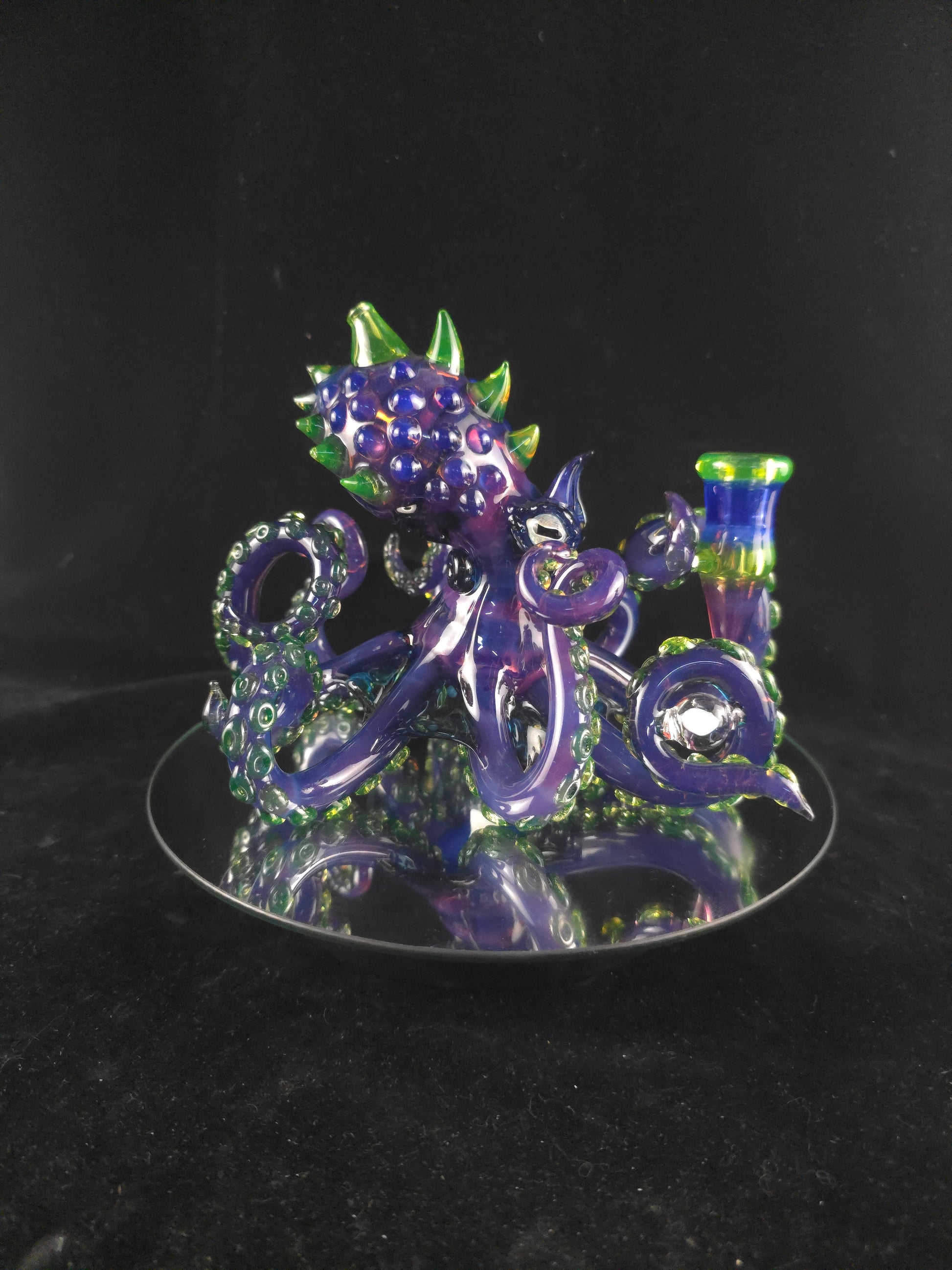 This detailed octopus sculpture is made from northstar glassworks atomic stardust over stargazer for a deep beautiful purple. Accented with Molten aura ion and holding a profound glass opal! Standing roughly inches tall and super thick. 14mm input with a 2 hole diffy. Signed and dated.
