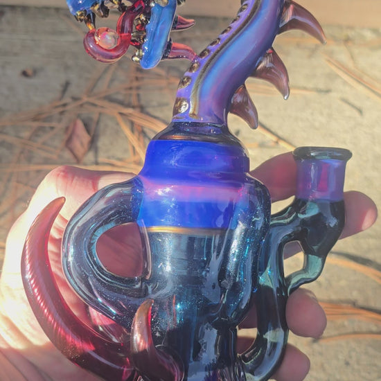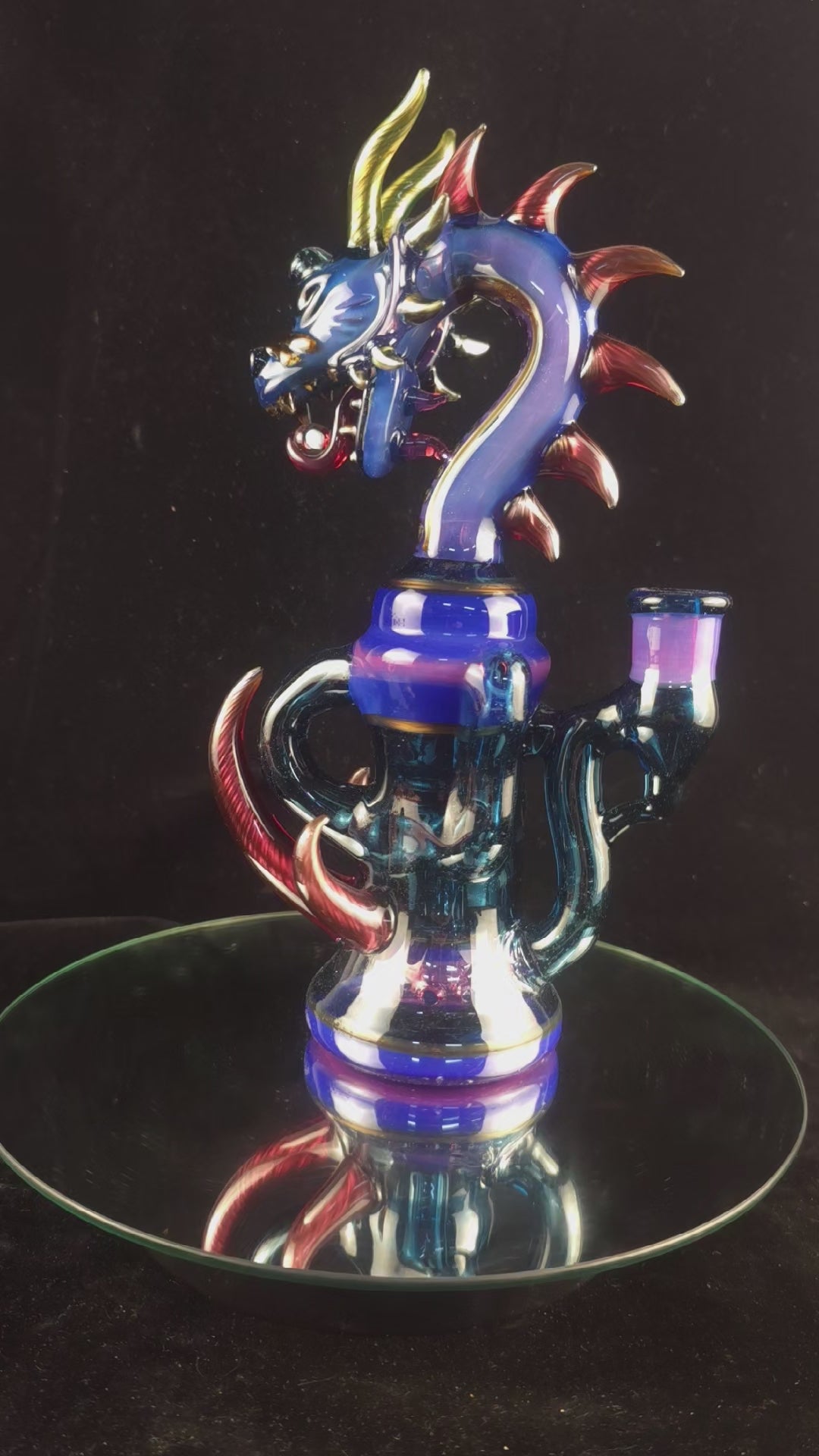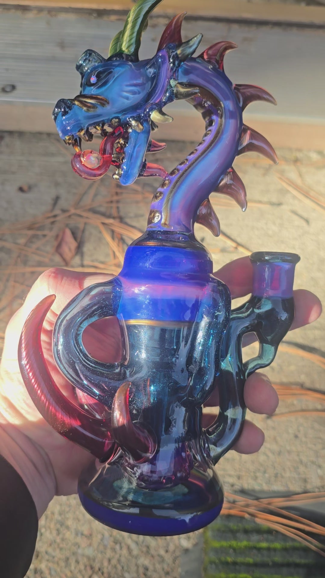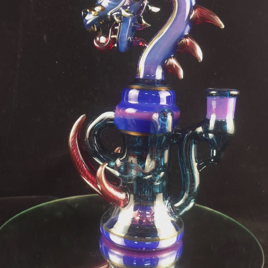 Standing roughly 10 inches tall this intricately sculpted tripple uptake recycler features a super thick 10mm input with a 9 hole penetration perc for outstanding function. Signed and dated.