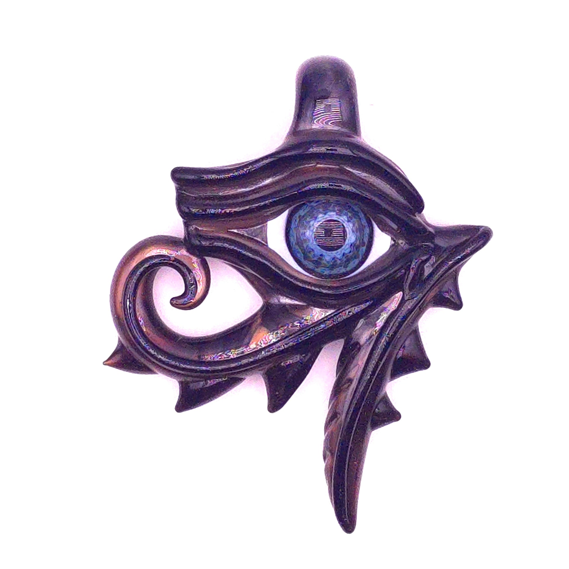 The right eye of Horus, or "the eye of Ra" pendant. Also known as the Wedjat, ancient symbol of the all-seeing eye, strength, protection from evil, royal power, and health. This pendant is made from molten aura electrum for a liquid metal effect. The iris features a super detailed uv accented eye milli. Signed and dated. Just over 3 inches long.