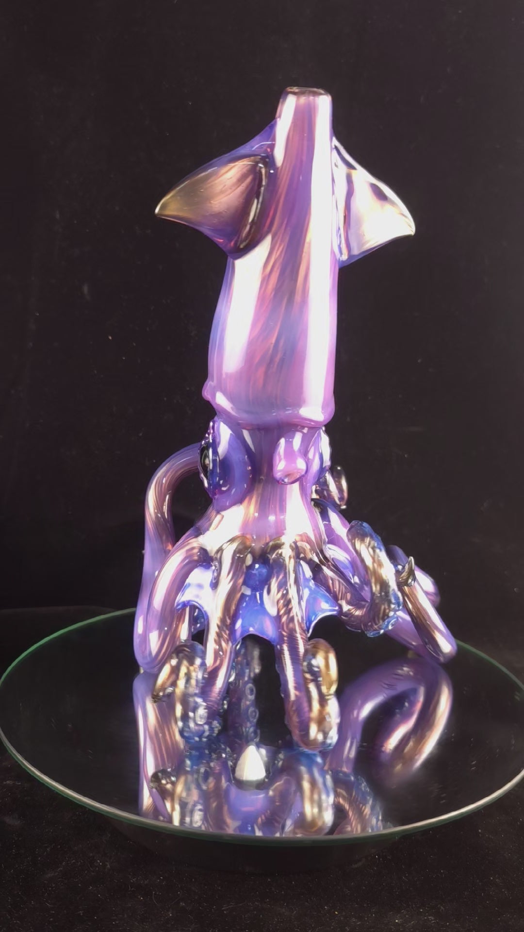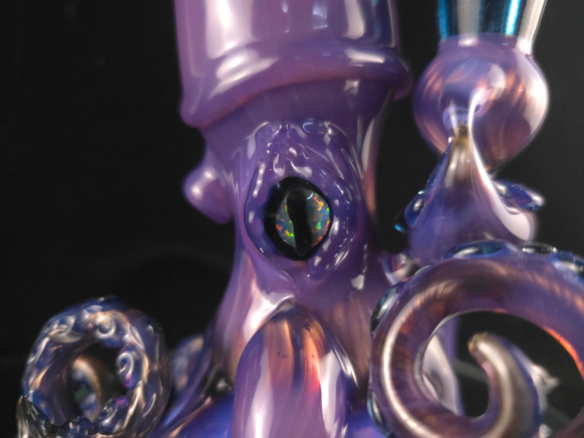 This squid sculpture is made from northstar glassworks stargazer over Molten Aura electrum. Its super thick and heavy. 10mm input with a 2 hole diffy for outstanding function. Opal eyes and focal point! Signed and dated.