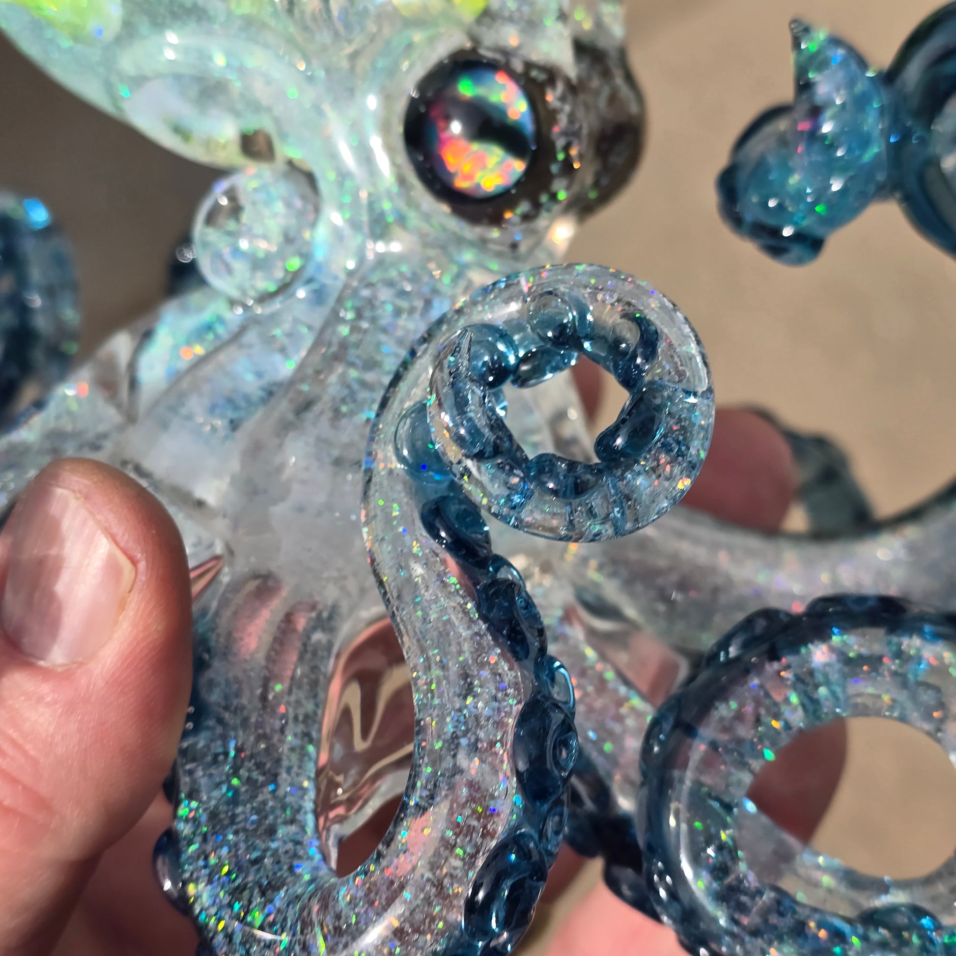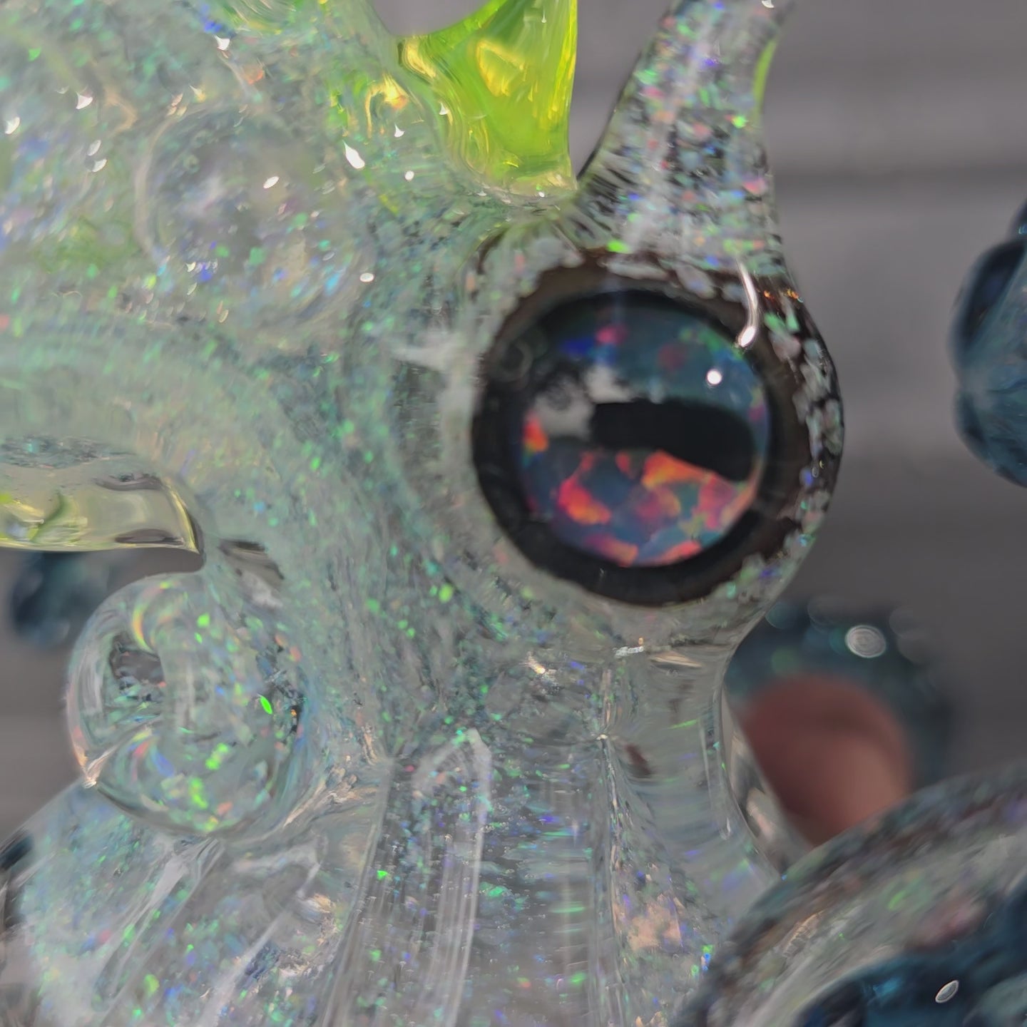 This octopus is made from my own crushed opal tubing. Accented with atomic stardust , ion and Lucy. 10mm input with a 2 hole diffy and internal splash guard! Signed and dated