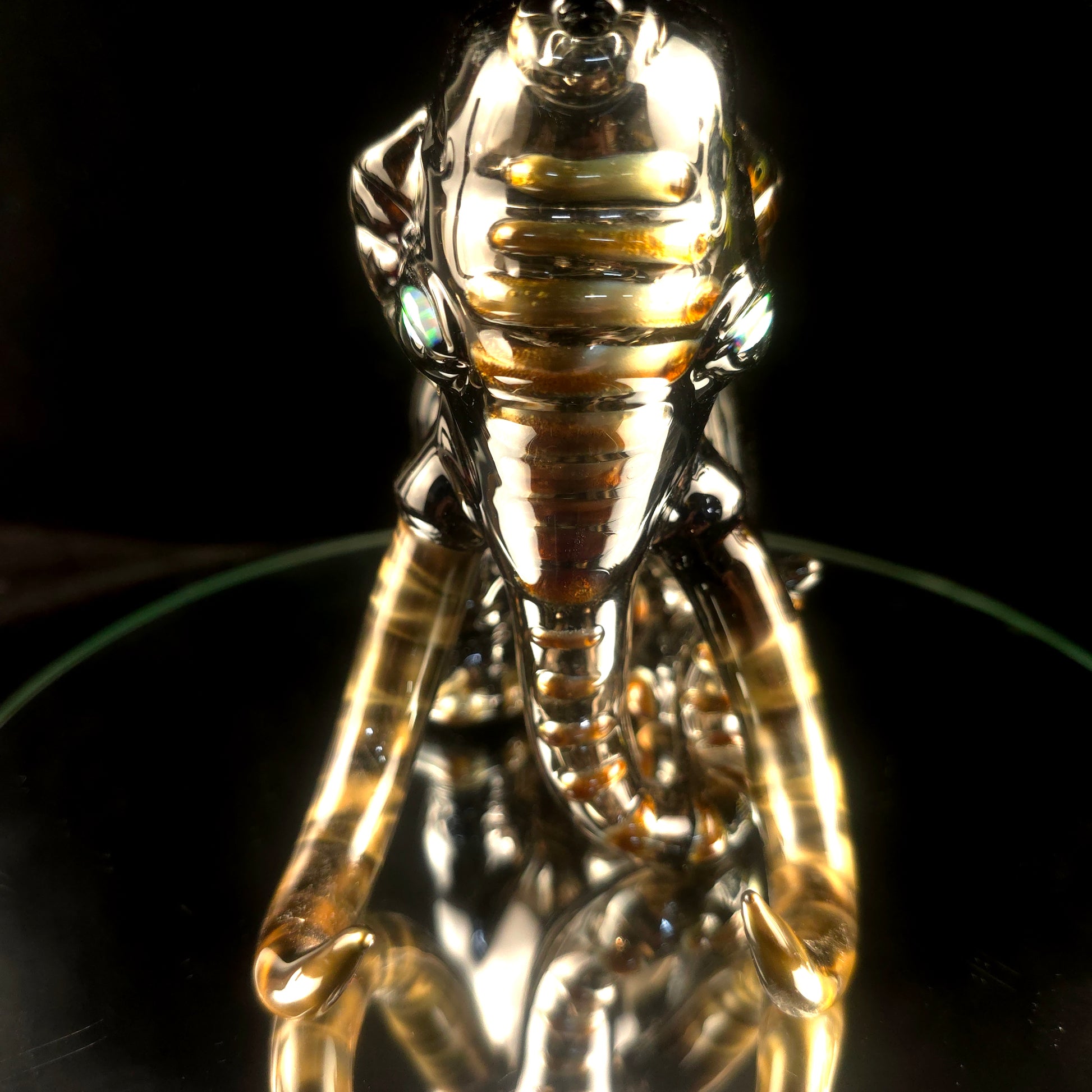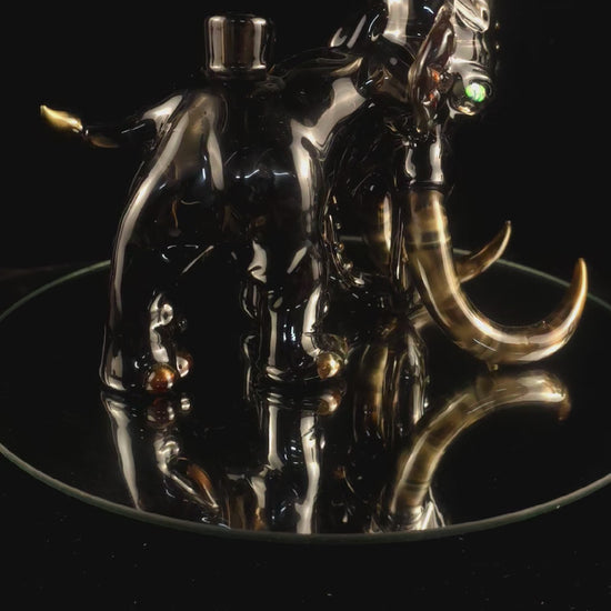 This 10mm Mastodon recycler features a 10mm input with a 9 hole diffuser and splashguard. Profound glass opal eyes! Stands just 4 3/4 inches tall and whips up a nice little whirlpool! Made from molten aura neutronium and electrum. Signed and dated.